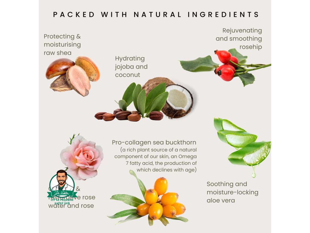 INCI: Aqua, Rosa centifolia Flower Water*, Simmondsia chinensis Seed Oil*, Cocos nucifera Oil*, Butyrospermum parkii Butter*, Helianthus annuus Seed Oil*, Glycerine**, Cetearyl Alcohol, Hippophae rhamnoides Fruit Extract*, Cetearyl Glucoside, Aloe barbadensis Leaf Juice Powder*, Rosa rubiginosa Fruit Extract*, Rosmarinus officinalis Leaf Extract*, Pelargonium graveolens Oil*, Rosa damascena Flower Oil*, Lactic Acid, Sodium Anisate, Sodium Levulinate, Sodium Lauroyl Lactylate, Xanthan Gum, Geraniol*, Eugenol* (prirodzene sa vyskytujú v esenciálnych olejoch).